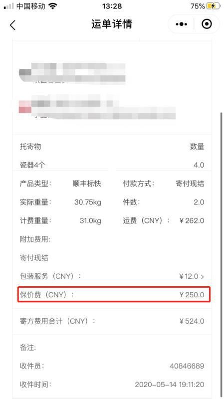 澎湃新闻记者在顺丰快递保价页面看到,保价费用计算规则为,物品价格在1-500元(含)时,保价费用为1元;物品价格在500(不含)-1000(含)时,保价费用为2元;物品价格在1000元(不含)以上时,保价费用=物品价格×千分之五。