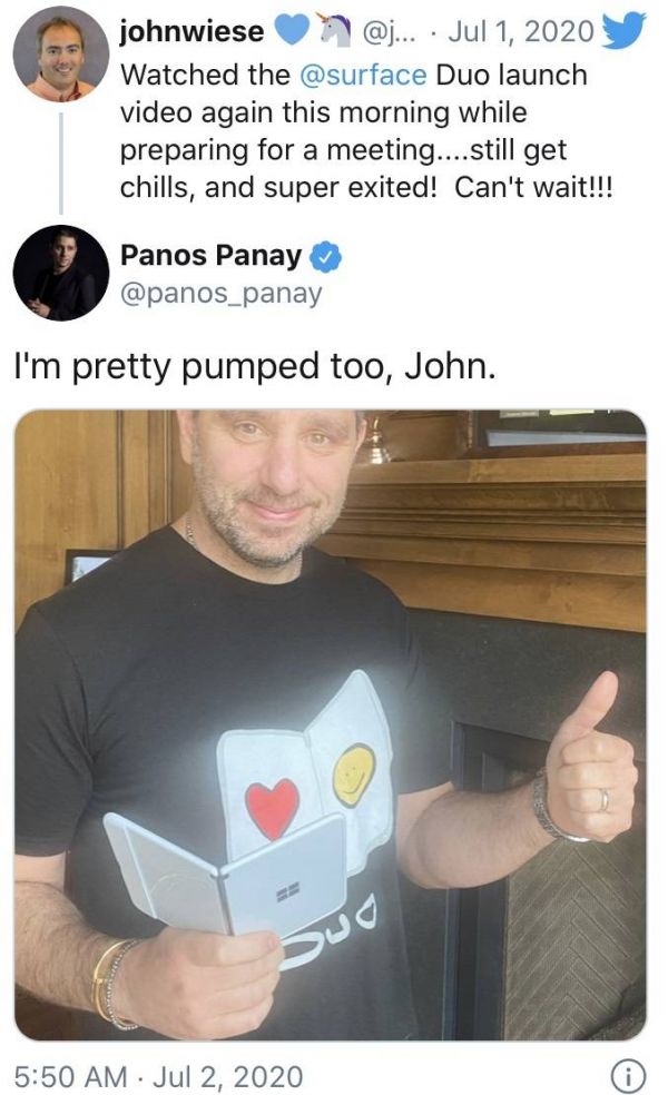 相比之下,P叔和他的同事则是激情满满。Johnwiese评论称自己重温了Surface Duo的发布视频,依然非常激动!已经等不及了!!!P叔回应自己同样非常兴奋。
