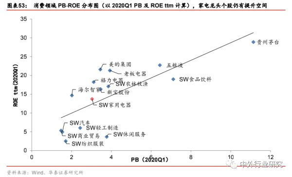 对比其他消费行业,家用电器指数PB 估值和 ROE 匹配度较高,考虑家电板块中龙头个股,我们会发现若给予家用电器龙头股相同ROE 下的市场平均 PB 估值,则龙头个股 PB估值尚有很大提升空间。