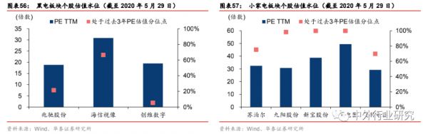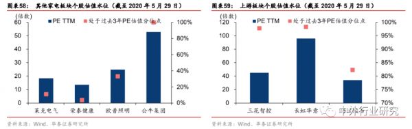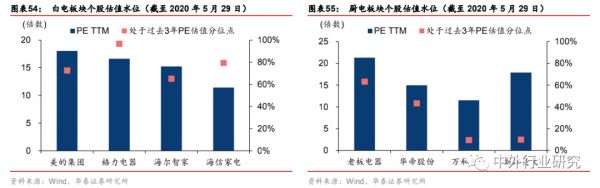 分子板块来看,白电企业(美的集团、格力电器、海尔智家)中,格力电器2020Q1 财务表现偏弱,公司PE 估值被动抬升,但相对来看白电龙头在盈利能力、资金杠杆、上游占款、营运资金管理上优势依然明显。从白电企业中PE 估值水平所处的过去 3 年的分位数来看,海尔智家及美的集团相对更低。