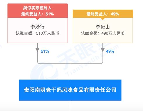 天眼查的数据显示,在2014年陶华碧退出后,“老干妈”品牌背后的贵阳南明老干妈风味食品有限责任公司由大儿子李贵山占股49%,小儿子李妙行占股51%。陶华碧仍任法定代表人和董事长。