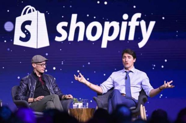 2018年5月,Shopify公司年会上,首席执行官托比亚斯·吕克(Tobias Lütke)与加拿大总理贾斯廷·特鲁多(Justin Trudeau)对话。图片来源:Canadian Press/Shutterstock