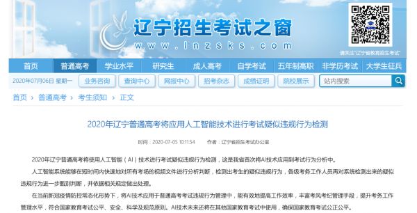 辽宁省招生考试办公室 7 月 5 日发文,称 2020 年辽宁普通高考,将应用人工智能技术,进行考试疑似违规行为检测。
