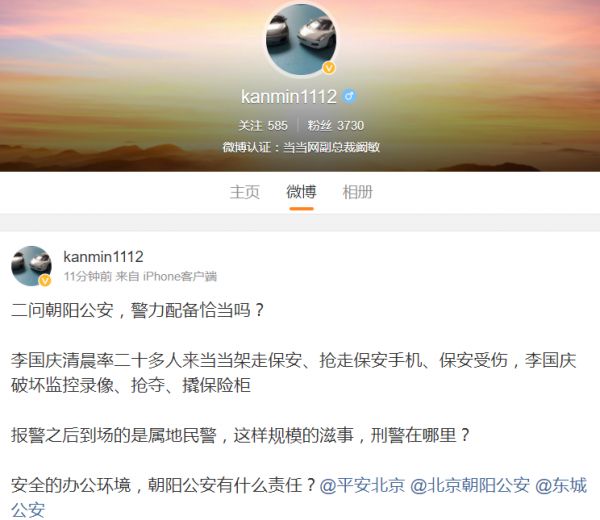 今日上午,当当发微博表示李国庆带20多人闯当当撬保险柜拿走资料,并表示已报警。