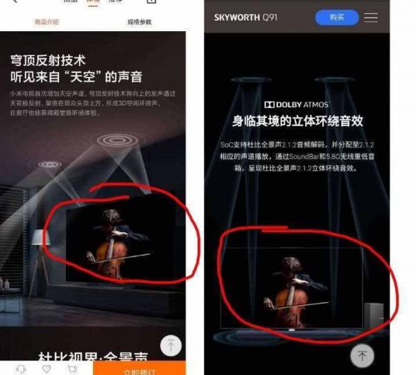 昨日,创维首席品牌馆唐晓亮发微博称小米电视产品名字和产品页抄袭创维。其表示,小米电视“天空声道”的名称与其2020年1月在CES发布的“魔音天空音场Wonder Audio Sky Echo”相似,产品页的插图设计也类似。