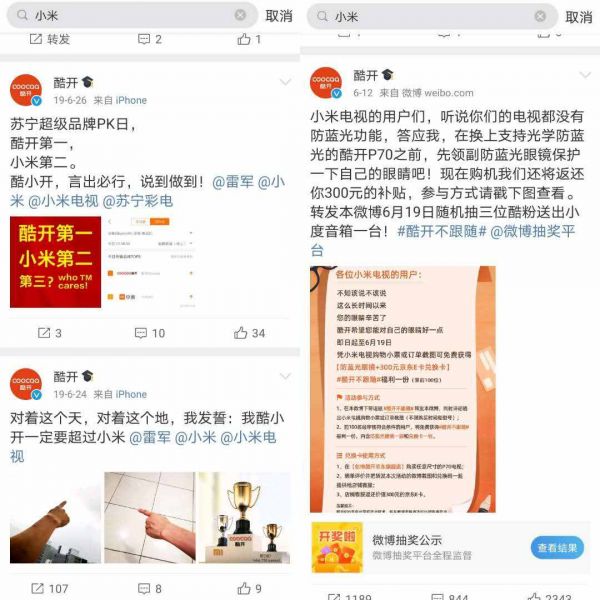 早前,酷开电视就在微博中称“小米电视都没有防蓝光功能”,“在换上酷开P70之前,先领一副防蓝光眼镜保护眼镜”,在转发推广活动中还送出数台小度音箱作为奖品。而在2019年的苏宁超级品牌PK日上,酷开微博还喊出了“酷开第一,小米第二”的口号。