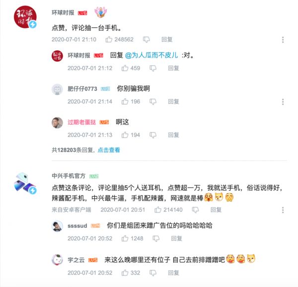 腾讯的这条动态截图在各大微信群中广泛传播,而盖楼的蓝V甚至还有大量“死对头”阿里系的官方账号,不少蓝V通过腾讯的动态开始了点赞抽奖活动。上一次能迎来这种互动量及破圈传播的蓝V互动事件,可能还要追溯到微博上的锦鲤抽奖活动。