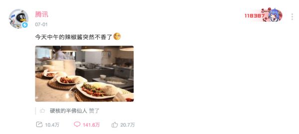 7月1日,在贵阳警方发布通报后,腾讯官方B站账号在中午发布了一条“今天中午的辣椒酱突然不香了”的动态,随即引发了各路蓝V跟帖互动,逐渐成为一次网络狂欢。如今,这一个腾讯B站动态转发、评论、点赞量已经超过10万、140万、20万。