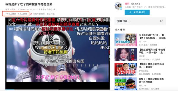 无独有偶,腾讯在老干妈事件爆发后,亦迅速在7月1日当天于B站贴出了一个《我就是那个吃了假辣椒酱的憨憨企鹅》视频,反应非常迅速,也备受业内好评。这支视频如今播放量破700万,弹幕数6.6万。