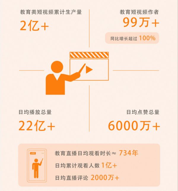 2019年10月17日,快手大数据研究院发布的《2019快手教育生态报告》显示, 教育短视频作者超过99万,教育类短视频累计生产量高达2亿条,累计付费用户超过160万。
