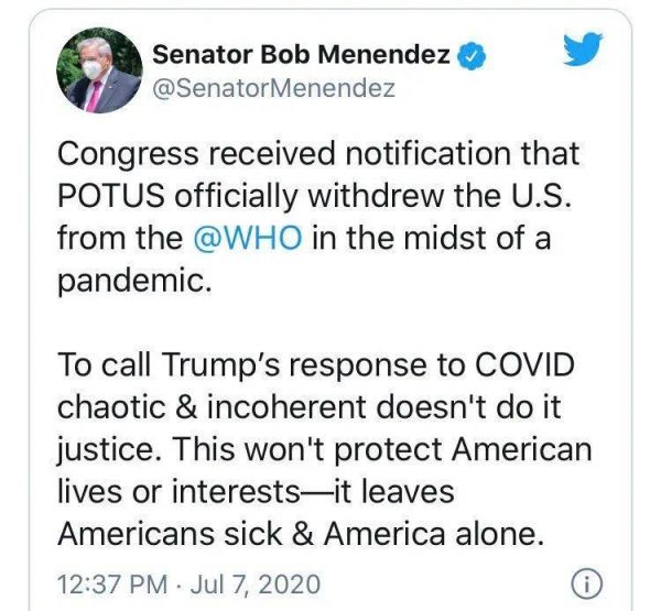“国会收到通知,美国总统在全球疫情大流行期间,正式将美国从世卫组织中撤出。”美国国会参议院外交关系委员会成员罗伯特·梅嫩德斯7月7日则称,特朗普在新冠疫情应对中表现出“混乱和前后不一”,退出世卫组织的举动“不会保护美国人民的生命或利益,而是使美国人生病,使美国孤立无援”。