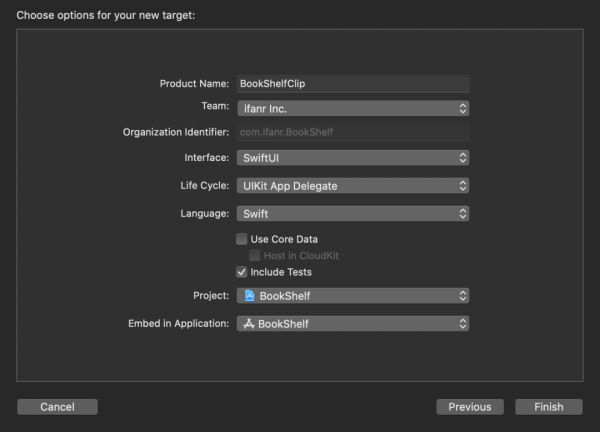 BooKShelfClip 的默认 identifier 以原始 target identifier 作为前缀,后面加上 .Clip。在 BookShelfClip Target 中 identifier 为 com.ifanr.BookShelf.Clip。