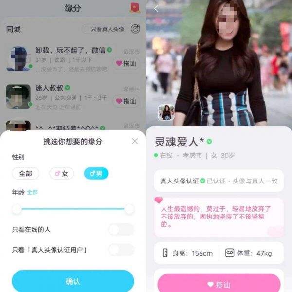 其首页名为“缘分”,进入首页需要进行实名认证,分为实名认证和语音认证,二选其一即可。成功进入首页后,可以看到同城的TA,系统会以单列信息流的形式对TA们的基本资料进行排列。用户若要查看真人头像,则需要进行实名认证。