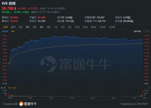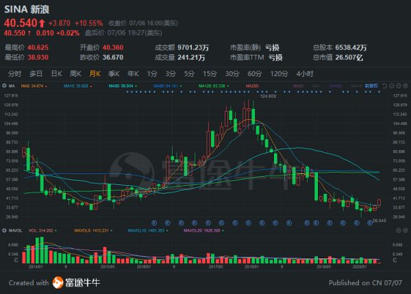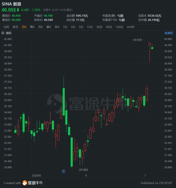消息公布后,新浪股价周一收盘大涨10%,不过第二日却直接低开低走。