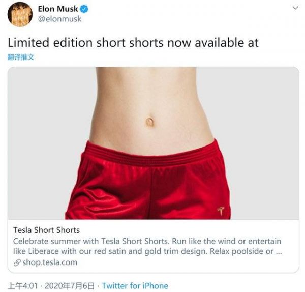 当地时间7月6日,马斯克真的兑现承诺,售价69.420美元的红色短裤在特斯拉网店出售的一系列品牌服装中亮相,价格尾数420对应的正是2018年马斯克在社交媒体上宣布考虑以420美元私有化公司。