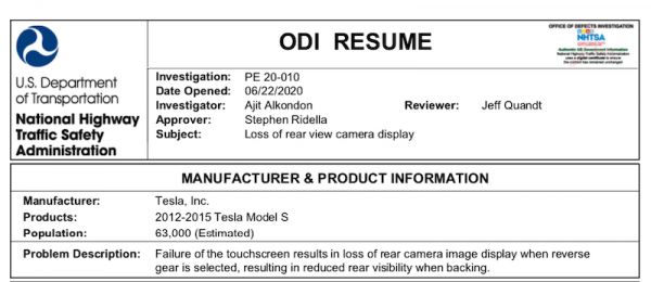 NHTSA预计将调查2012年~2015年间生产的约6.3万台特斯拉Model S。该机构对其问题的简述是:在选择倒车档时,触摸屏故障导致后摄像头图像的显示内容丢失,从而造成倒车时后方的能见度降低。