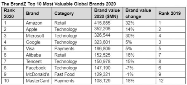 2020年BrandZ最具价值全球品牌100强排行榜发布(附完整榜单)