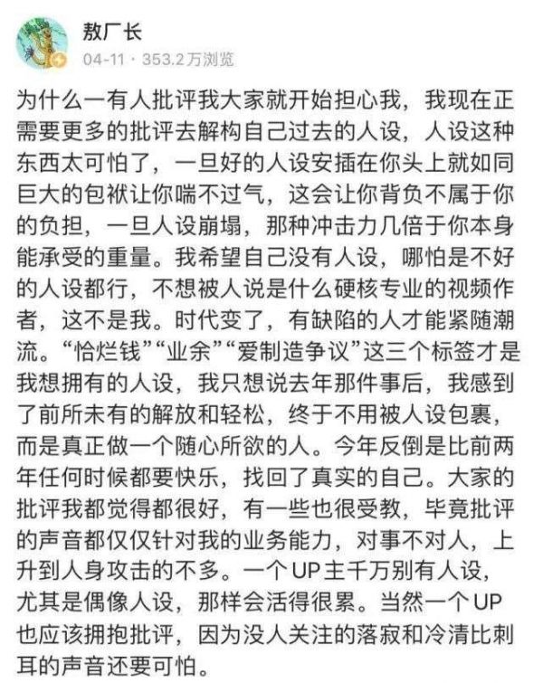 面对这样的情况,敖厂长随后发了一段动态,表示“有缺陷的人才能紧随潮流”,人设这种东西太可怕了,“恰烂钱”、“业余”、“爱制造争议”这三个标签才是自己想要的人设。“去年那件事之后,我才感到前所未有的解放和放松,终于不用背人设包裹,而是做一个真正随心所欲的人。”