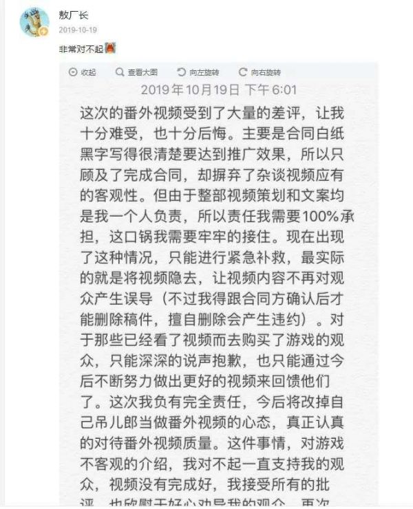 在被喷上热搜之后,敖厂长将视频删除,并在B站上发布道歉声明,承认为实现合同上“达到推广效果”的条款,他摈弃了“杂谈视频应有的客观性”,策划制作了这个视频,要“负100%的责任”。