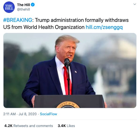 就在昨天,白宫宣布美国正式退出世界卫生组织(WHO)。联合国秘书长发言人Stephane Dujarric证实,已收到特朗普政府发出的只有短短三句话的通知,并表示如果美国满足提前一年通知的既定条件,并履行目前该承担的财务义务,退出将于明年某个时候生效。