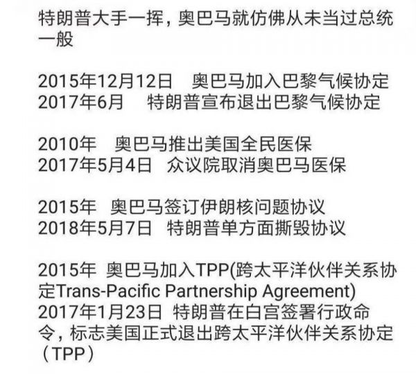 这也不是特朗普第一次由于担心美国利益受损而“退出群聊”了。有网友总结,特朗普大手一挥,奥巴马就仿佛从未当过总统一般。