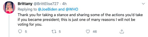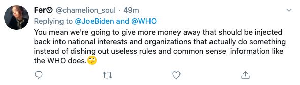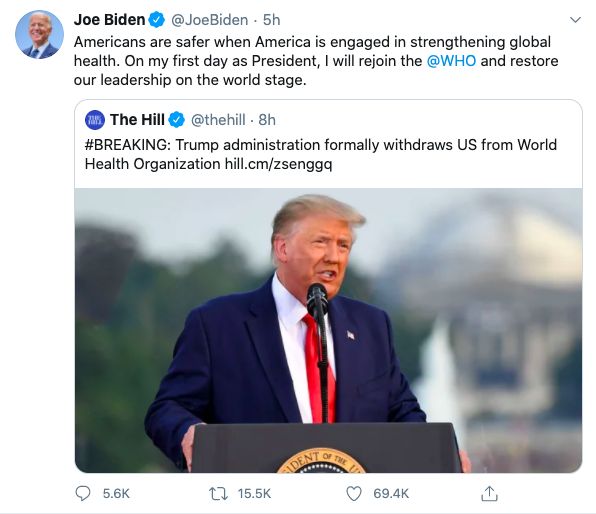 此前为了11月大选已经和特朗普势同水火的拜登顺势发推,试图拉一波好感:“我当上总统的第一天,就会重新加入WHO,重现我们在世界舞台上的领导力。”
