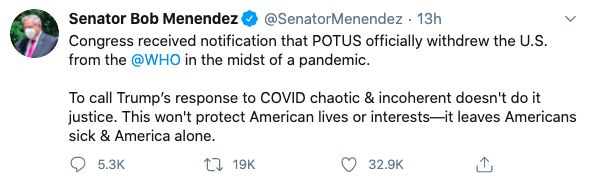 于是到了5月19日,特朗普直接“警告”WHO总干事谭德赛称,除非WHO在“30天内进行重大的实质性改善”,否则将永久切断对后者的资助。三周后,WHO进行的审查并没让美国满意,特朗普的威胁再度升级——他不打算再跟这些人玩了。