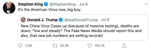 前两天,斯蒂芬·金还在推特上直接怼再次嚷着“中国病毒”的特朗普道:“现在这是美国病毒了,大男孩儿。”