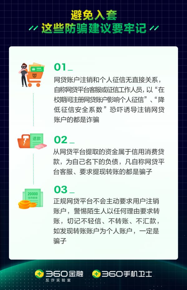 对此,360金融反诈实验室提醒,个人征信是由中国人民银行为个人建立的“信用档案”,其中的信贷信息主要记录个人通过商业银行借贷还贷行为,网贷APP账户注销和个人征信无直接关系,并且任何第三方无权获取征信信息。以“大学生网贷账户影响个人征信”、“降低征信安全系数”为由恐吓诱导注销网贷账户的说辞都是诈骗。(一橙)