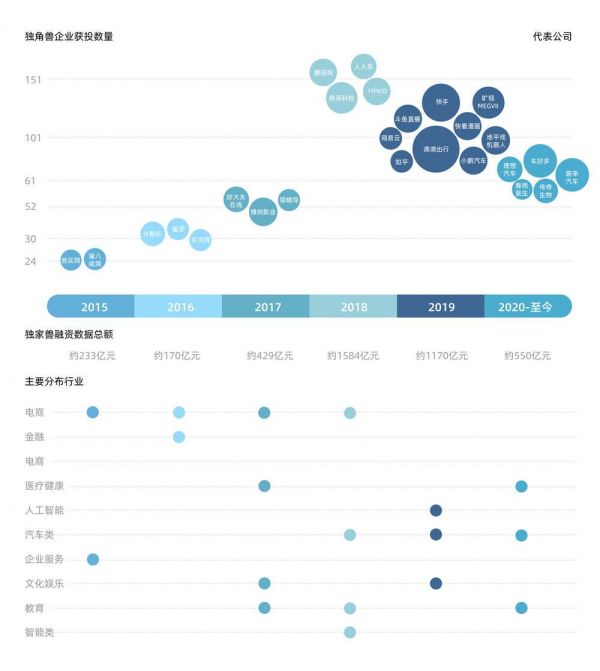 可以发现,从2015~2020年,五年时间,资本密集投入到金融、互联网教育、人工智能、汽车出行等领域,在2018~2019年,经过多轮融资和时间的推移,独角兽数量达到近五年最高峰。