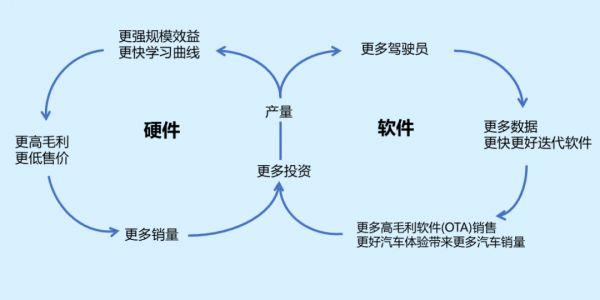 简单讲,特斯拉的厉害之处在于“卖一辆车,赚两份钱”。硬件、软件通吃,两手都要抓,两手都要硬。硬软两个,势能层层叠加,形成了特斯拉独特的双轮商业模式。