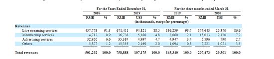 作为一家LGBTQ垂直社区,Blued目前主要提供四项服务:直播服务、会员服务、广告服务、以及健康和家庭计划咨询服务。凭借这些业务,Blued营收节节攀升。招股书显示,2018年、2019年和2020年一季度,公司营收分别为5.01亿元、7.59亿元和2.07亿元。