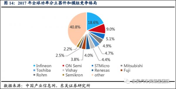在功率半导体分立器件和模块市场,中国产业信息网的数据显示,2017市场提供商主要为英飞凌、安森美、意法半导体、三菱、东芝、瑞萨电子等厂商。