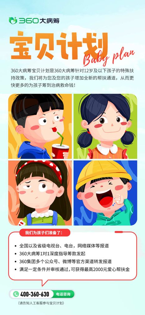 网易科技讯 7月10日消息,网络大病救助平台360大病筹推出大病儿童专项救助行动“宝贝计划”。该计划将联合全国各地医院、地方媒体以及基金会等第三方非营利性组织,通过平台配捐、媒体报道、基金会扶持等方式,为0-12岁的大病儿童提供专属救助通道。