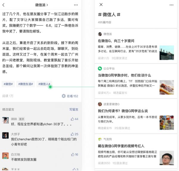 简单来说,类似微博或头条的话题功能,公众号原创文章也可以添加自定义标签,每篇图文最多可添加 3 个标签,而打上标签的文章会形成文章合集,读者通过标签可以进入合集页。