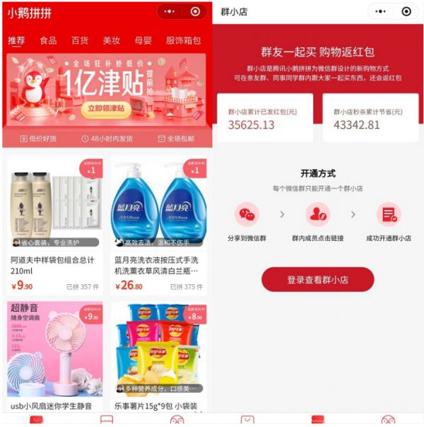 5月初,微信上线了一款名为“小鹅拼拼”的小程序和公众号,主推拼单购物服务,购物模式类似拼多多,其Slogan为:“没有什么事情比买到好东西更快乐!”。6月15日,小鹅拼拼上线了一个名为“群小店”的功能,可在亲友群、同事同学群内跟大家一起买东西,同时还会返红包。
