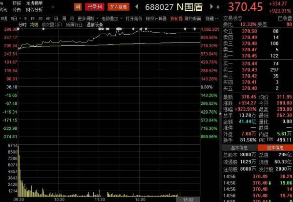 国盾量子开盘即较发行价上涨673.9%至280元;盘中股价一度高达399元,较发行价上涨1002.82%,超越了天智航(上市首日涨幅614.29%)创下的科创板股票上市首日涨幅纪录。