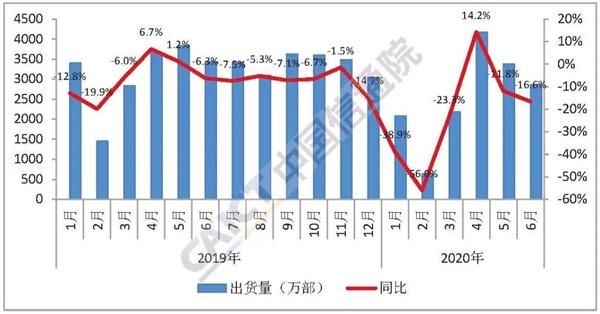 2020年6月,智能手机出货量2770.6万部,同比下降16.6%,占同期手机出货量的96.8%。1-6月,智能手机累计出货量1.49亿部,同比下降16.1%,占同期手机出货量的97.3%。
