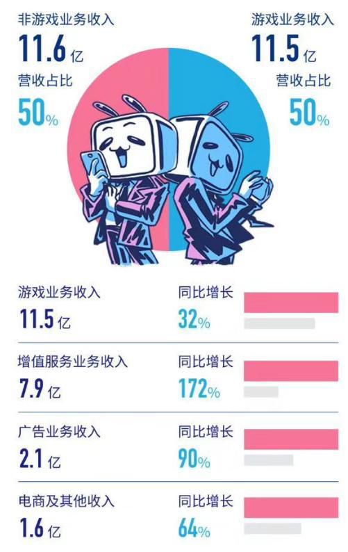 最关键的是,B站商业化进展一直不太理想。有人指责B站在游戏上投入资源过多,但那也是无奈,谁让它的广告收入成长不起来呢。今年Q1财报显示,其广告收入仅为2.1亿元,还不到23.2亿总营收的1成。