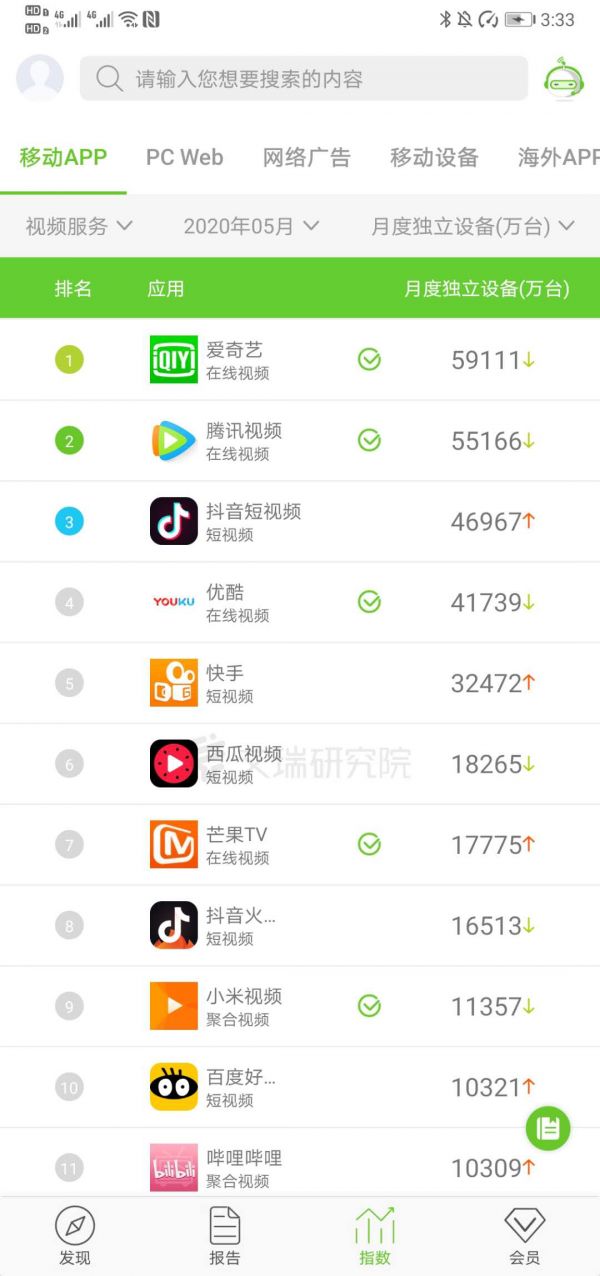 使用艾瑞研究院APP上的移动指数排行榜查看,发现在视频服务的大类目下,B站的月独立设备排在的第11位,相比于“资本”驱动的爱/优/腾、快手、抖音、好看视频等APP。过去商业化很保守的B站表现可算相当亮眼,作为一个聚焦二次元、年轻人的视频弹幕网站,出圈战略一旦成功,非常有希望成长为一个可与快、抖比拼的综合视频平台。