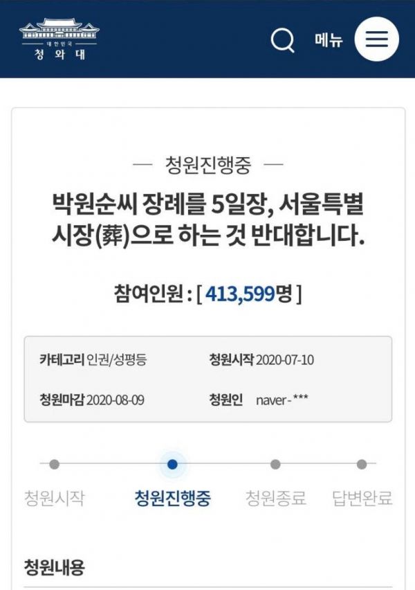 青瓦台请愿网站上取消葬礼的请愿,目前请愿人数已超过40万 / 青瓦台请愿网站