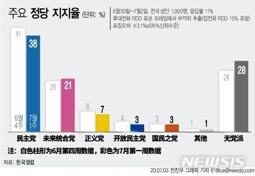 事件后,韩国自认无党派的应答者占比上升至28%,仅次于执政党支持者(38%)/ 盖洛普民调