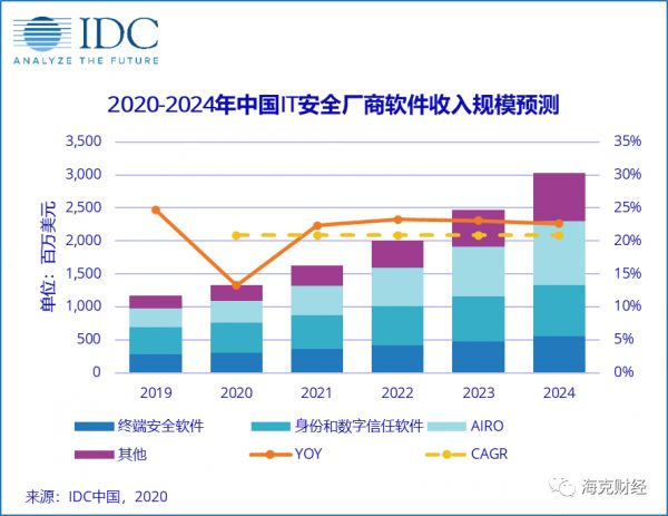 据调研机构IDC于2020年5月15日发布的《2019年下半年中国IT安全软件市场跟踪报告》,2019年中国IT安全软件市场厂商整体收入为11.7亿美元(约合81.2亿人民币),较2018年增长24.66%;IDC预测,到2024年,这一数字或可达30.2亿美元(约合212.6亿人民币),未来5年整体市场年复合增长率(CAGR)或为20.86%。