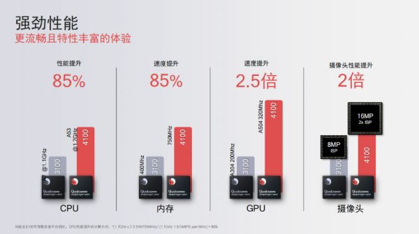 性能表现上,Wear 4100+ 相较于上一代,CPU 性能提升 85%,内存速度提升 85%,GPU 速度提升 2.5 倍,摄像头性能提升 2 倍(支持 800万 + 1600 万像素双摄像头)。