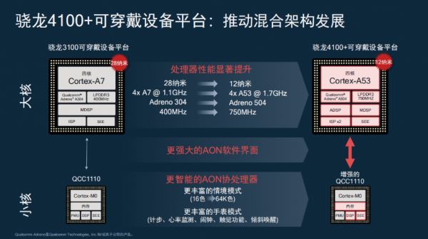 协处理器方面,骁龙 4100+ 带来了更智能的 AON 协处理器,支持更丰富的情境模式,色彩支持由 16 色升级为 64K 色,另外针对计步、心率监测、闹钟、触觉功能等也提供了更好的体验。