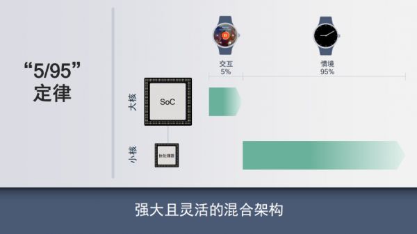 在发布会上,高通提出可穿戴设备的5/95 定律,意思就是我们在使用智能手表时,仅有 5% 的时间会做出真实交互,比如控制音乐播放、回复信息、测试心率、移动支付等,而其余的 95% 仅仅是单纯的佩戴,或者看个时间而已。