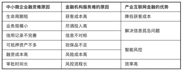 (四)产业互联网金融服务商相比传统金融机构有四方面优势。中小微企业天然具有生命周期短、业务规模小、抵押资产少、信息不对称等问题,过去我国采用城商行及农商行服务当地的做法,效率并不够高,不能完全满足中小微企业融资需求。产业互联网金融相比传统金融机构服务可以有效解决获客成本、信息孤岛、智能风控、审批效率等问题。