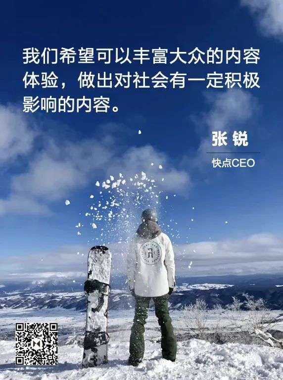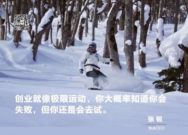 快点CEO张锐是个“追求极致且能折腾的宅男”,他说自己爱好不多,喜欢看电影——豆瓣13年的用户,在豆瓣上标注的电影超过3000部;喜欢滑雪——单板老司机,滑了13个雪季,横扫瑞士、新西兰、加拿大、日本、中国的各大雪场,多次在全国业余组的滑雪竞速赛中取得名次,在最近一次飞跳台的过程中,终于把腿摔断了。