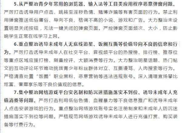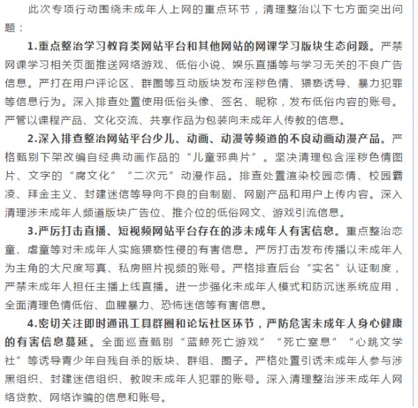 此次专项行动围绕未成年人上网的重点环节,清理整治七方面突出问题,包括重点整治诱导未成年人无底线追星、饭圈互撕等价值导向不良的信息和行为。