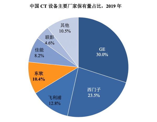 据弗若斯特沙利文统计,截至2019年,我国CT设备保有量为24743台,东软医疗的设备占10.4%——低于GE、西门子、飞利浦三大巨头,但位列国产品牌第一。